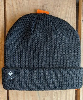 A super soft and comfy, cuffed, waffle knit toque (or beanie for any of you from the USA) with our logo. Represent!  Available in grey, black, stone, navy, forest and rust!  This new run is thicker and warmer than our last run of toques. Stop by a check them out!