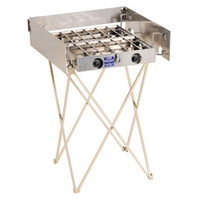 Stove stand and optional windscreen is available for 16", 18", 22" and 26" stoves. The stand height is 32", making the cooking surface 35" high. The weight is 14 lbs for the smaller stand and 17 lbs for the larger stand. The stand comes with its own bag and folds up to about 4".