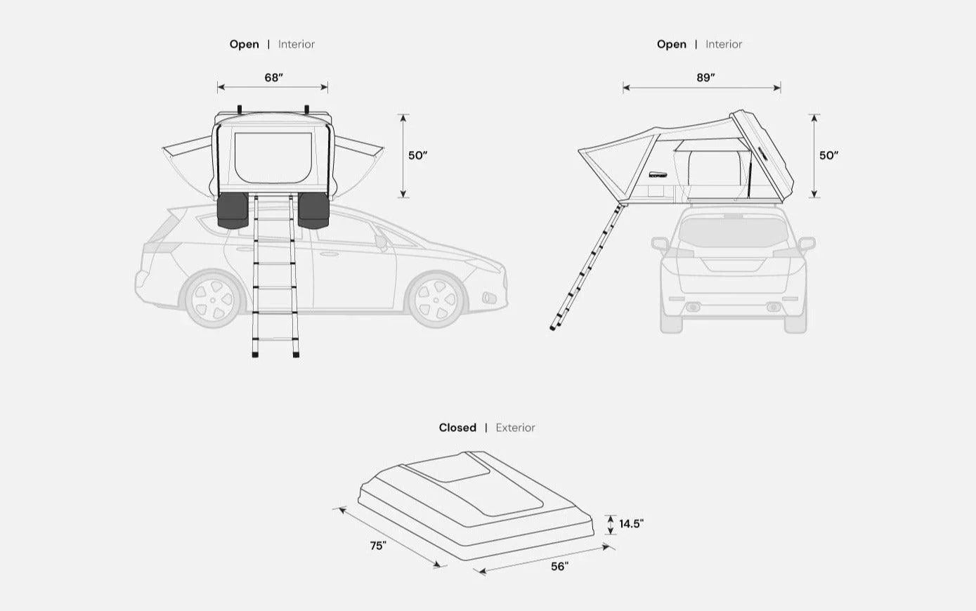 - Included With Tent: 7.5' Ladder, Rest EZ Sleep System, Universal Mounting Kit, 2 Detachable Shoe/Gear Pockets, 3 LED lights, 6-pocket Gear Grid, 2 Convertible window awnings, Bedding storage duffle